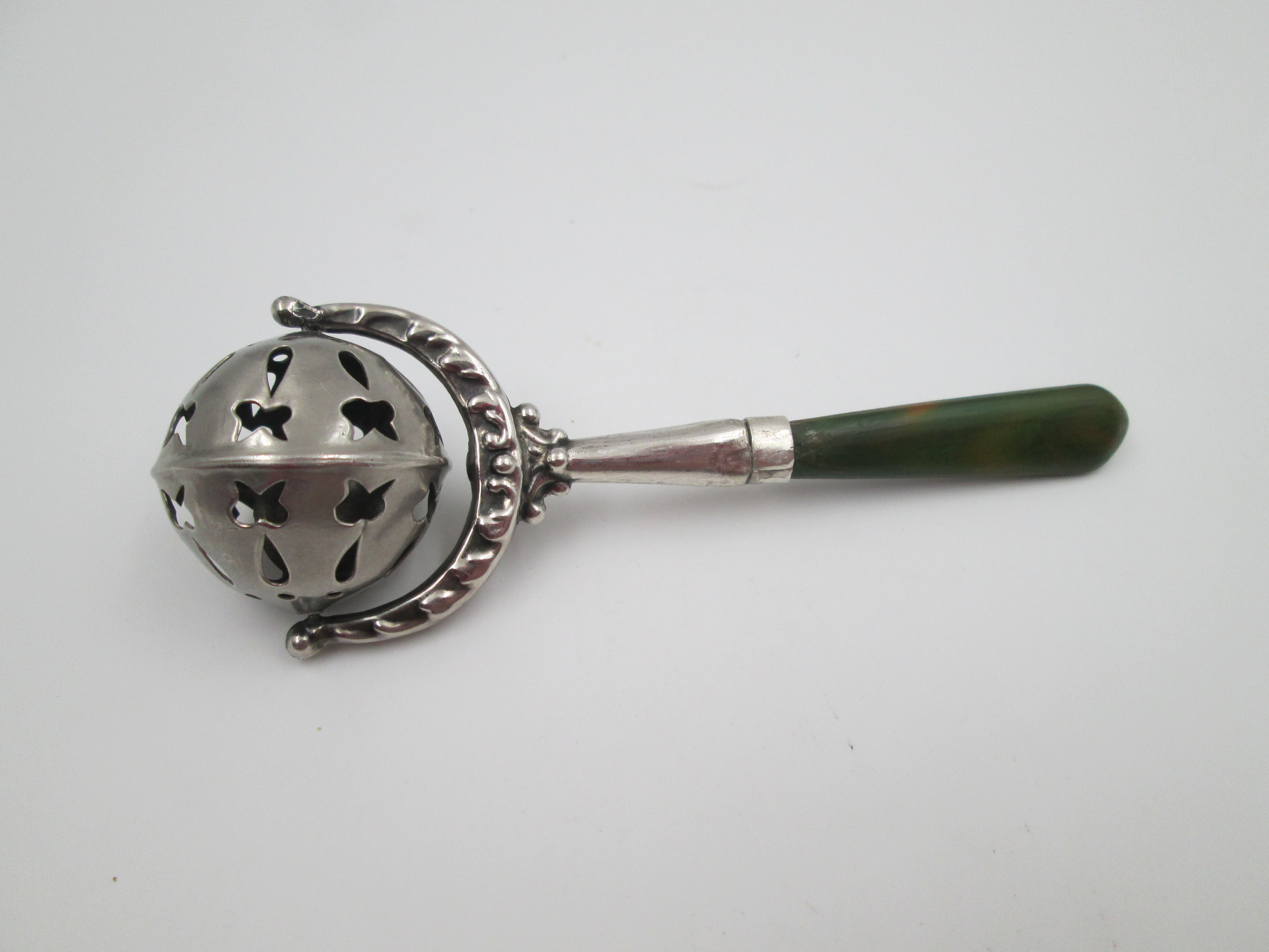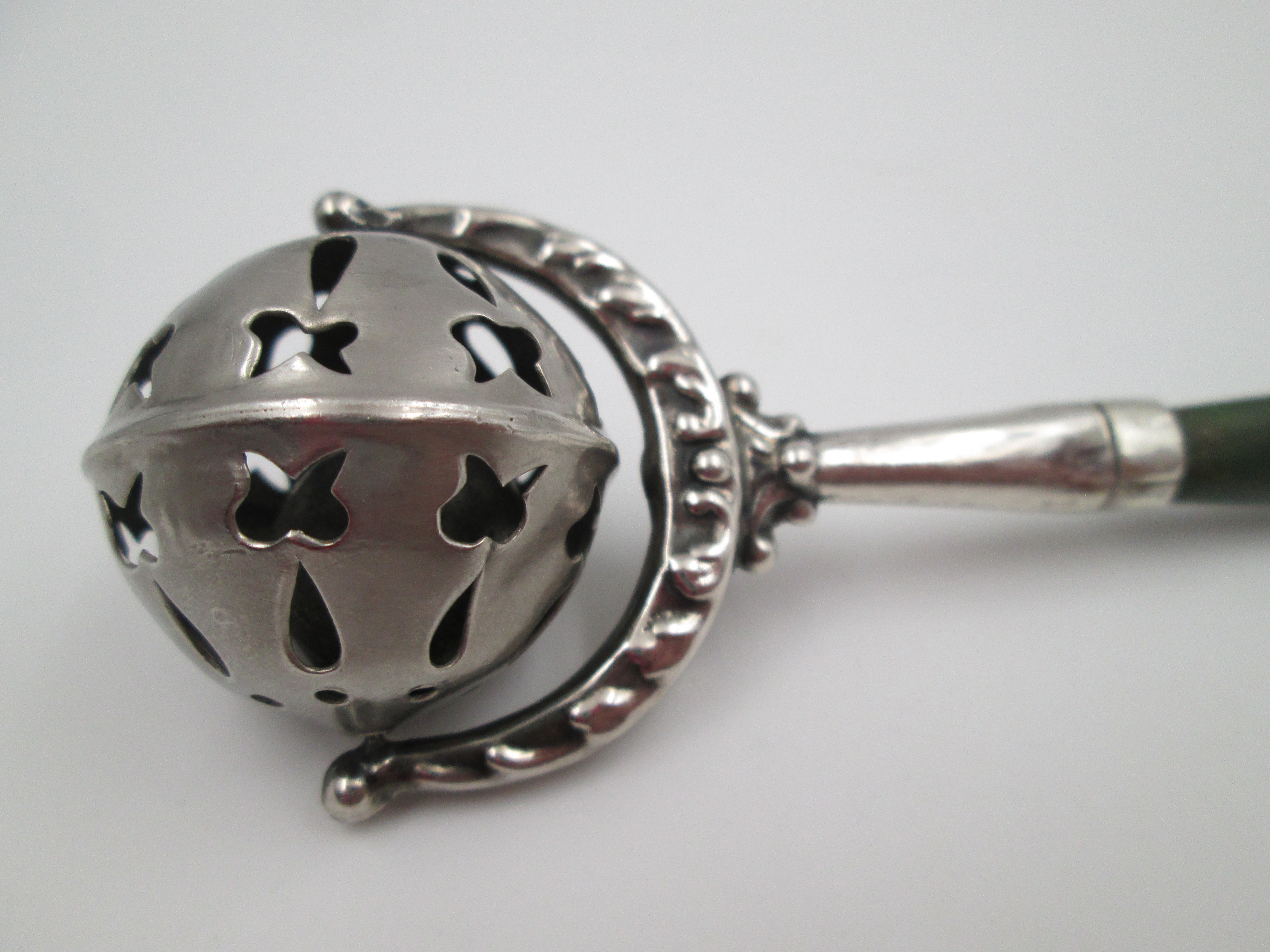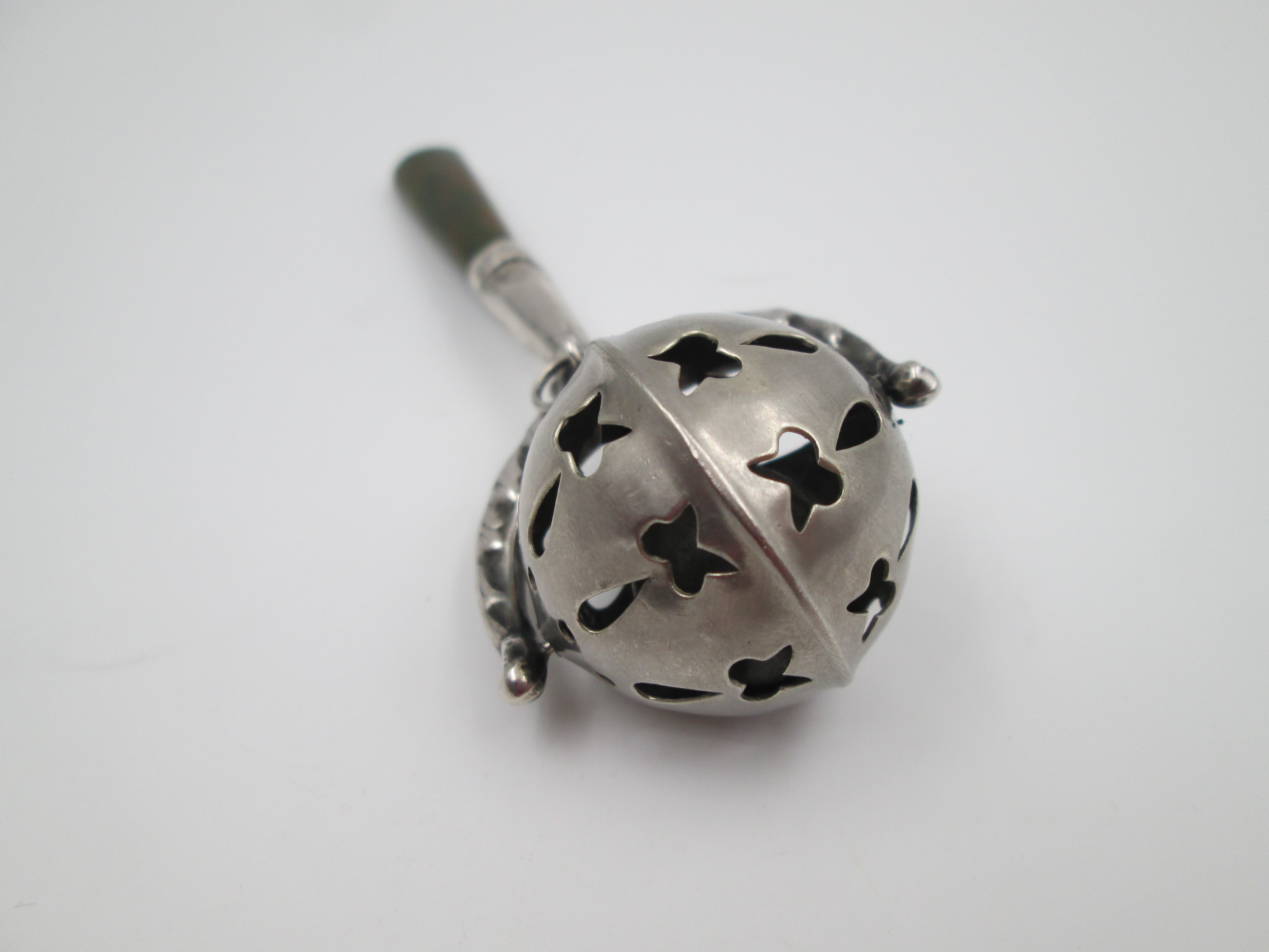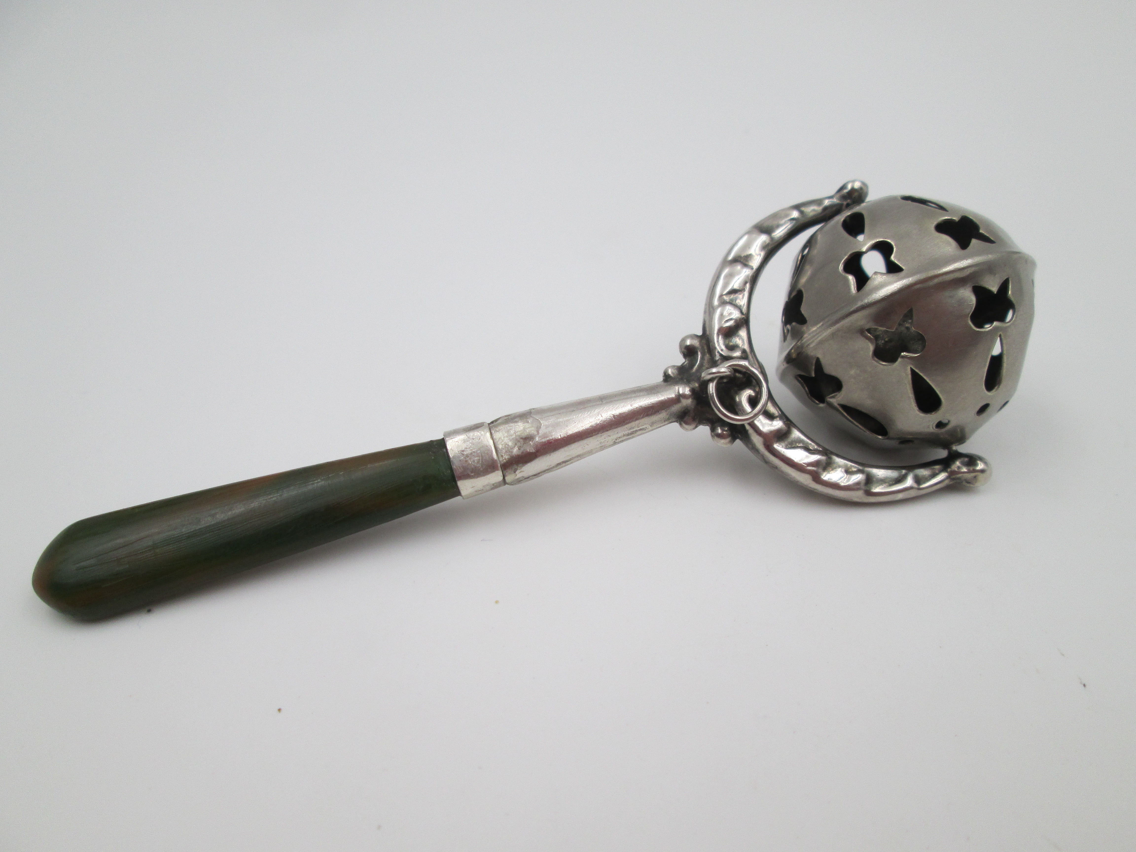 Baby rattle with handle. Sterling silver & bitone resin. Sphere with drops and butterflies