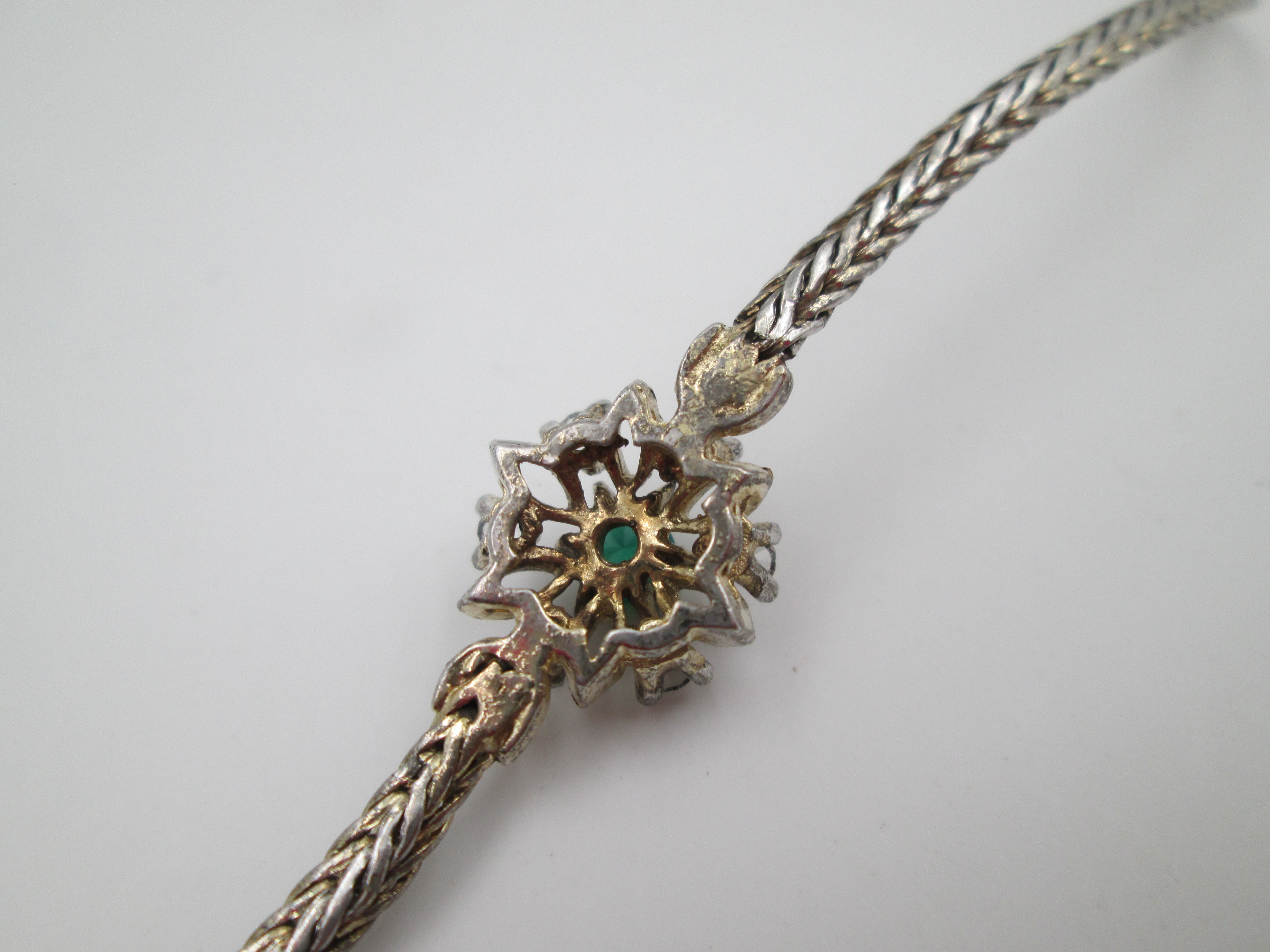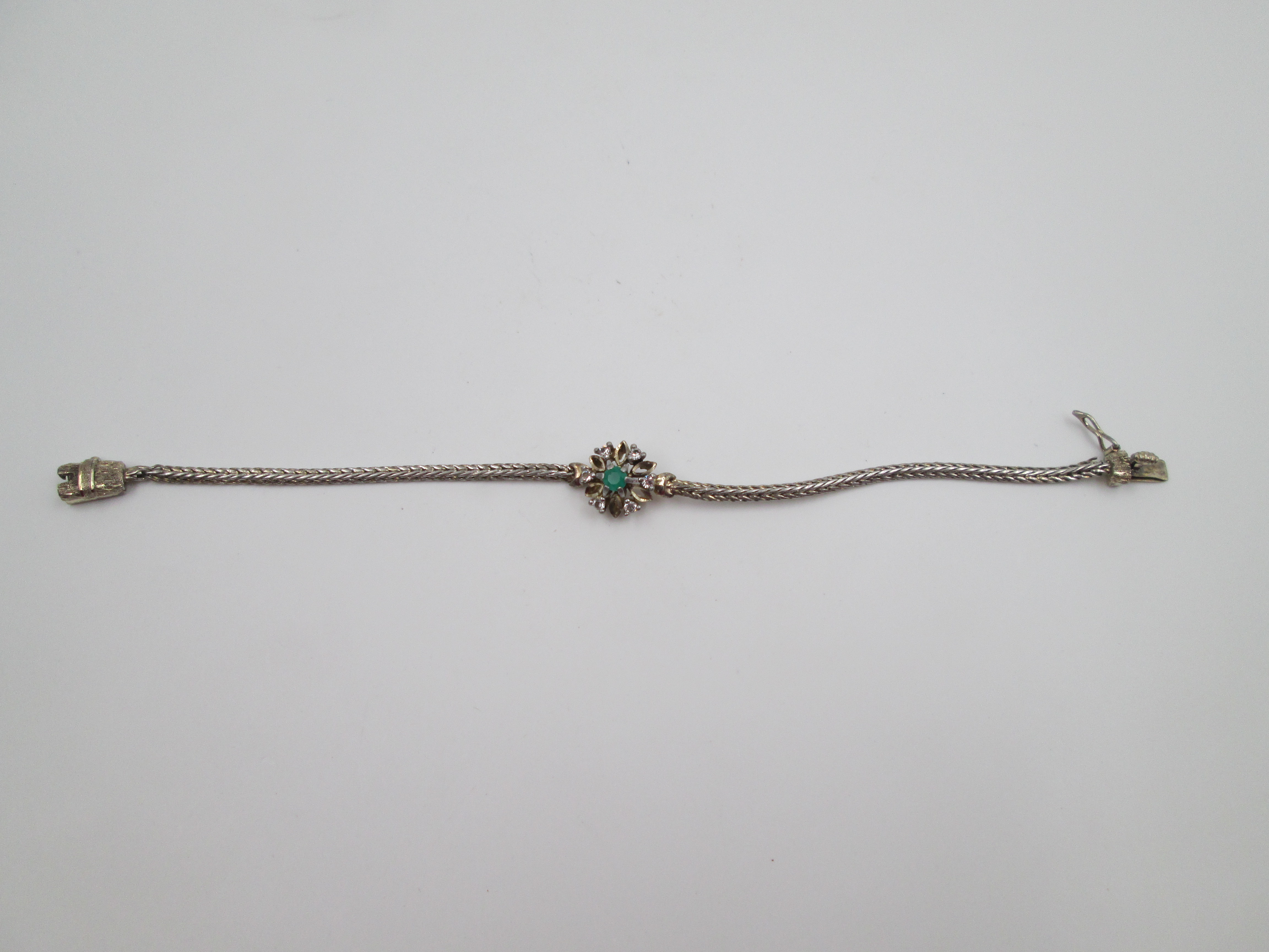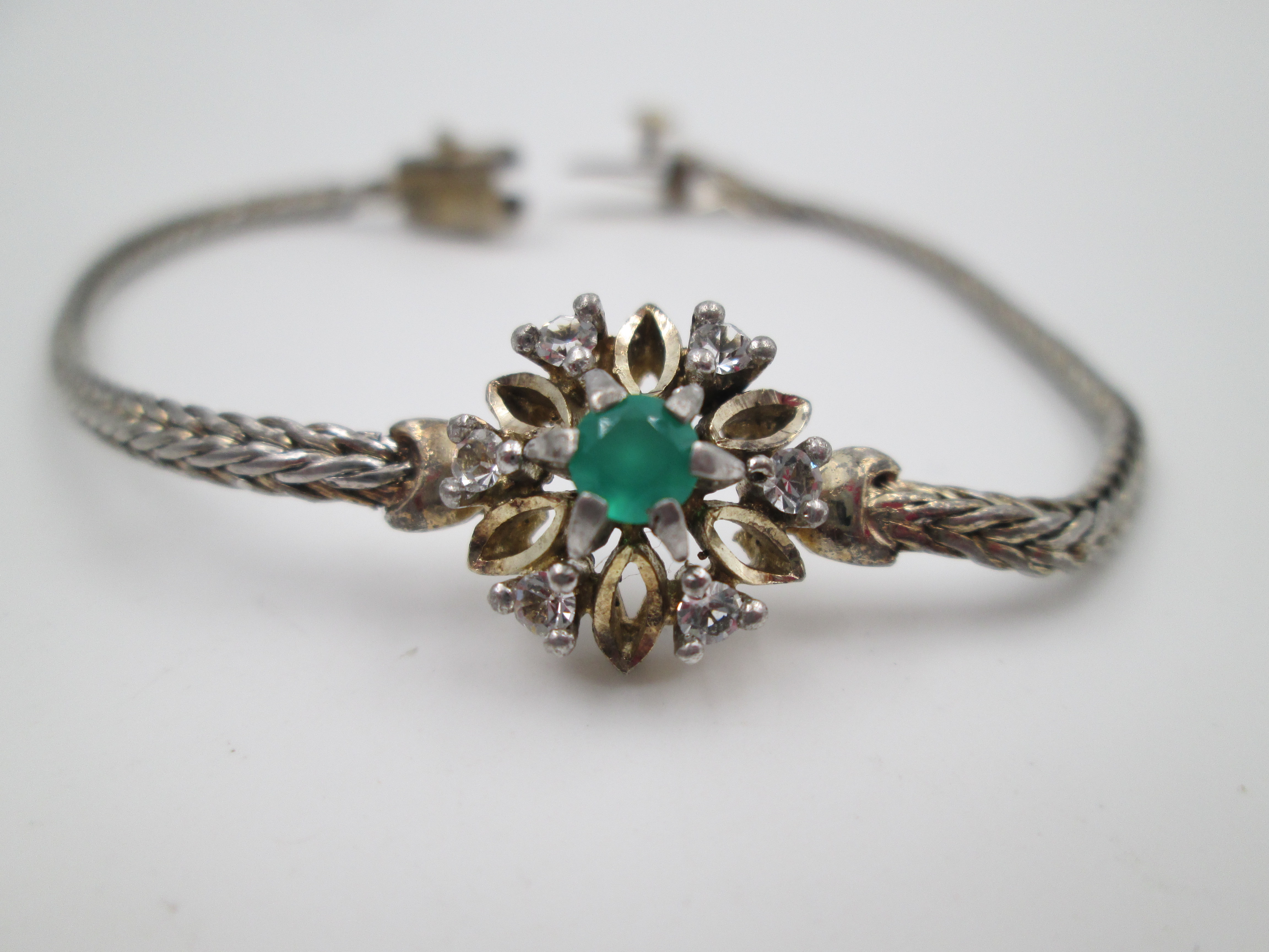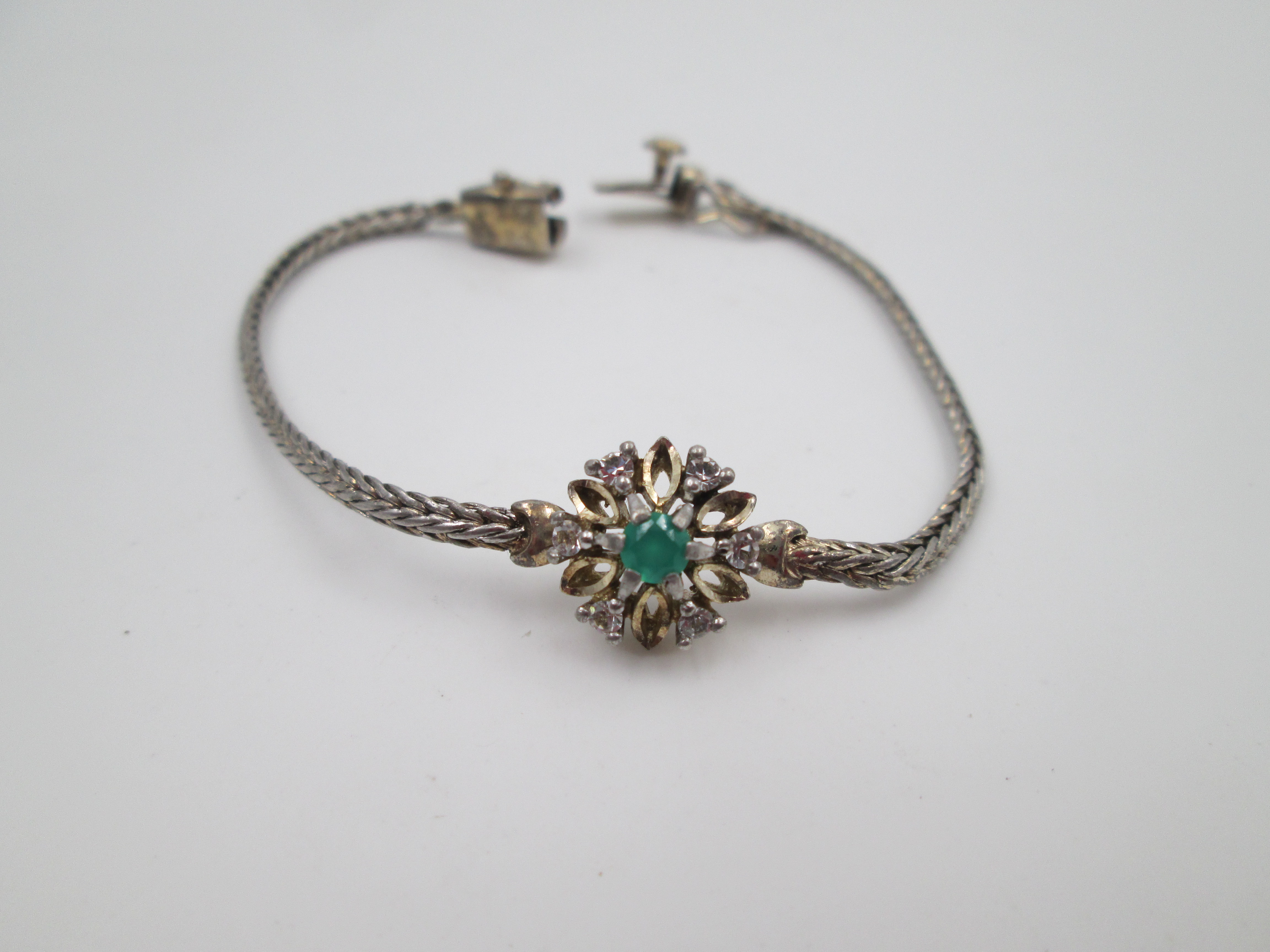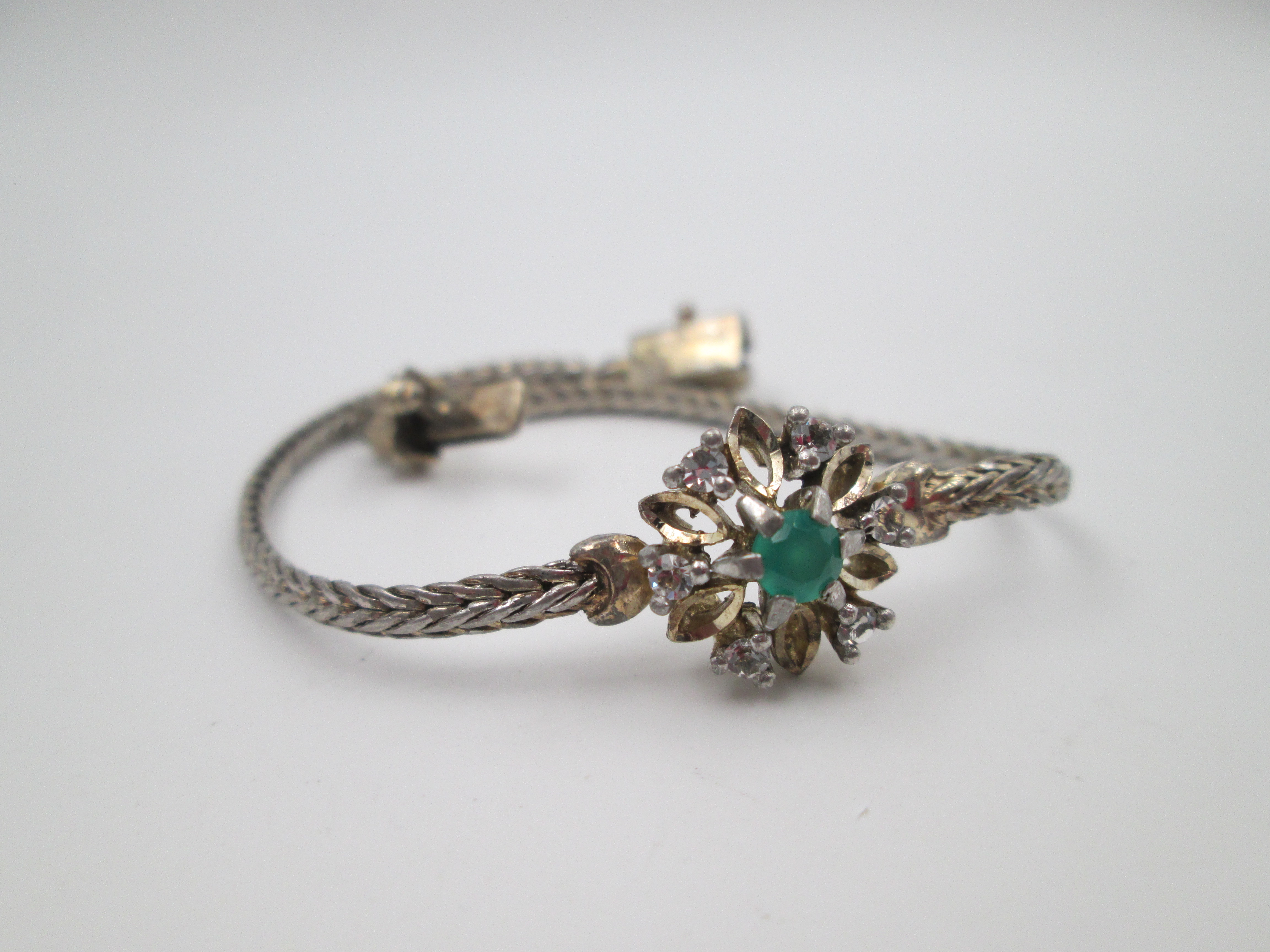 Wedding bracelet. Silver & vermeil. White sapphires and green gem rosette. Tab clasp