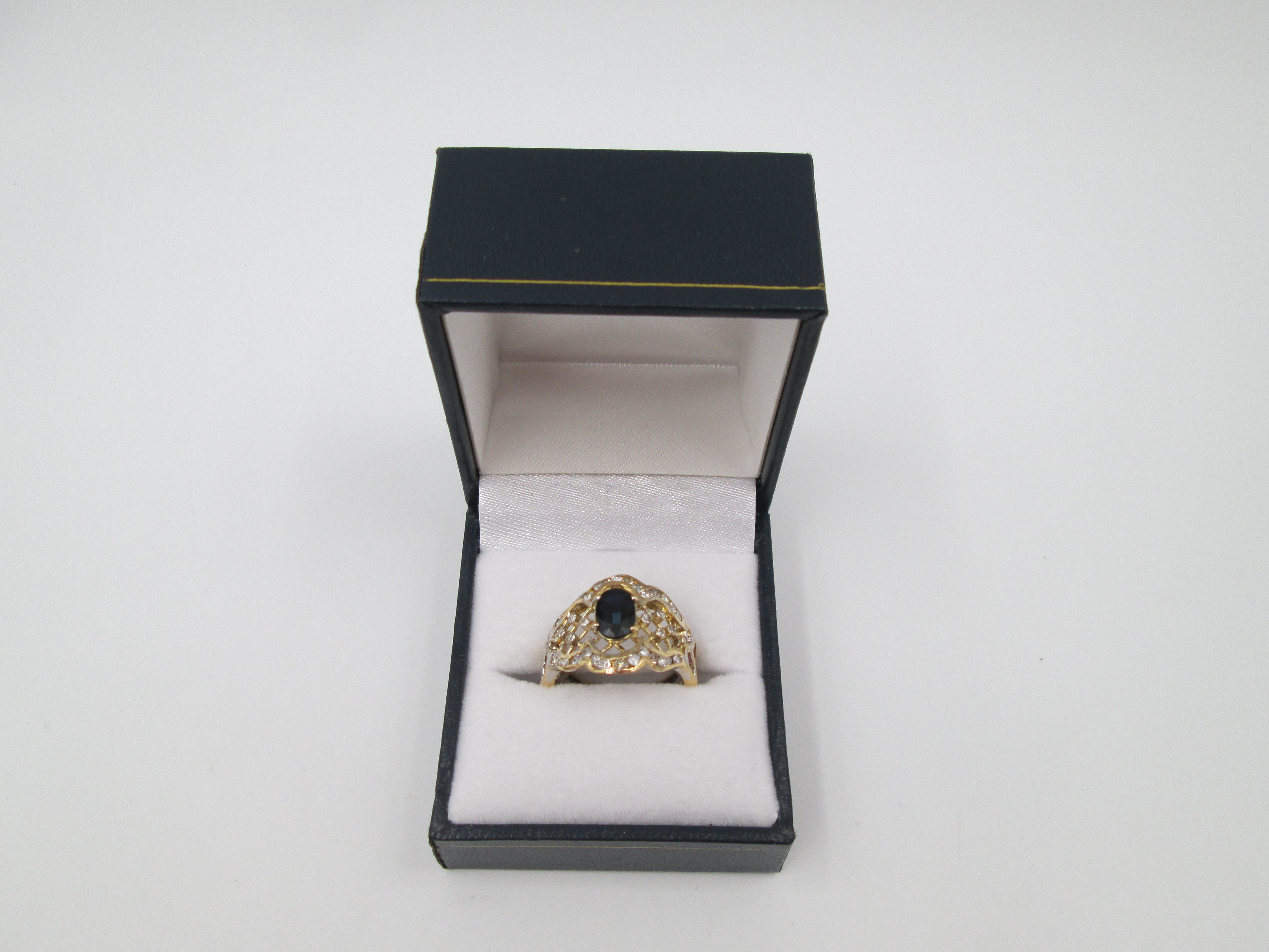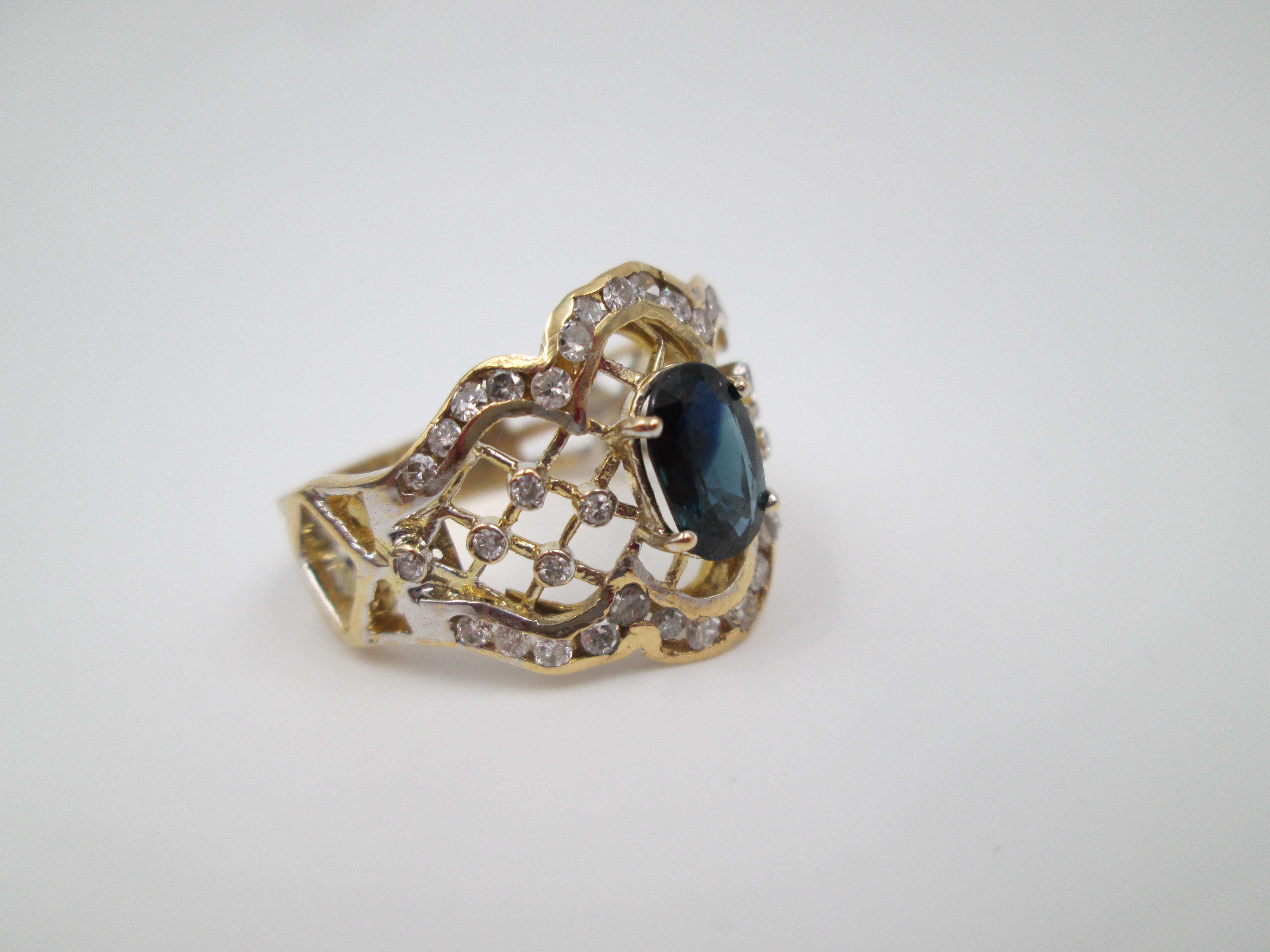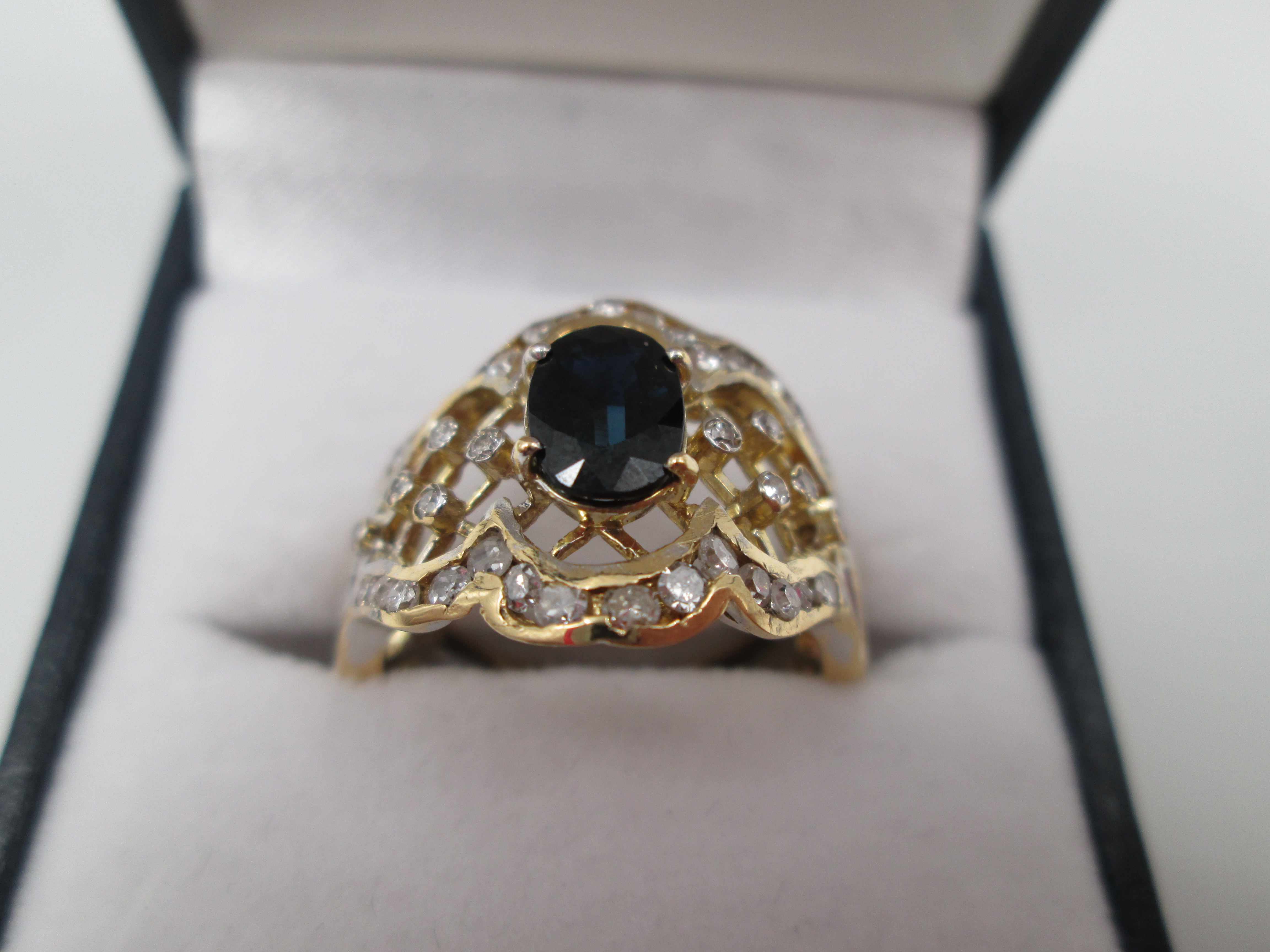 Women's openwork ring. 18 karat yellow gold, diamonds and sapphire. Europe