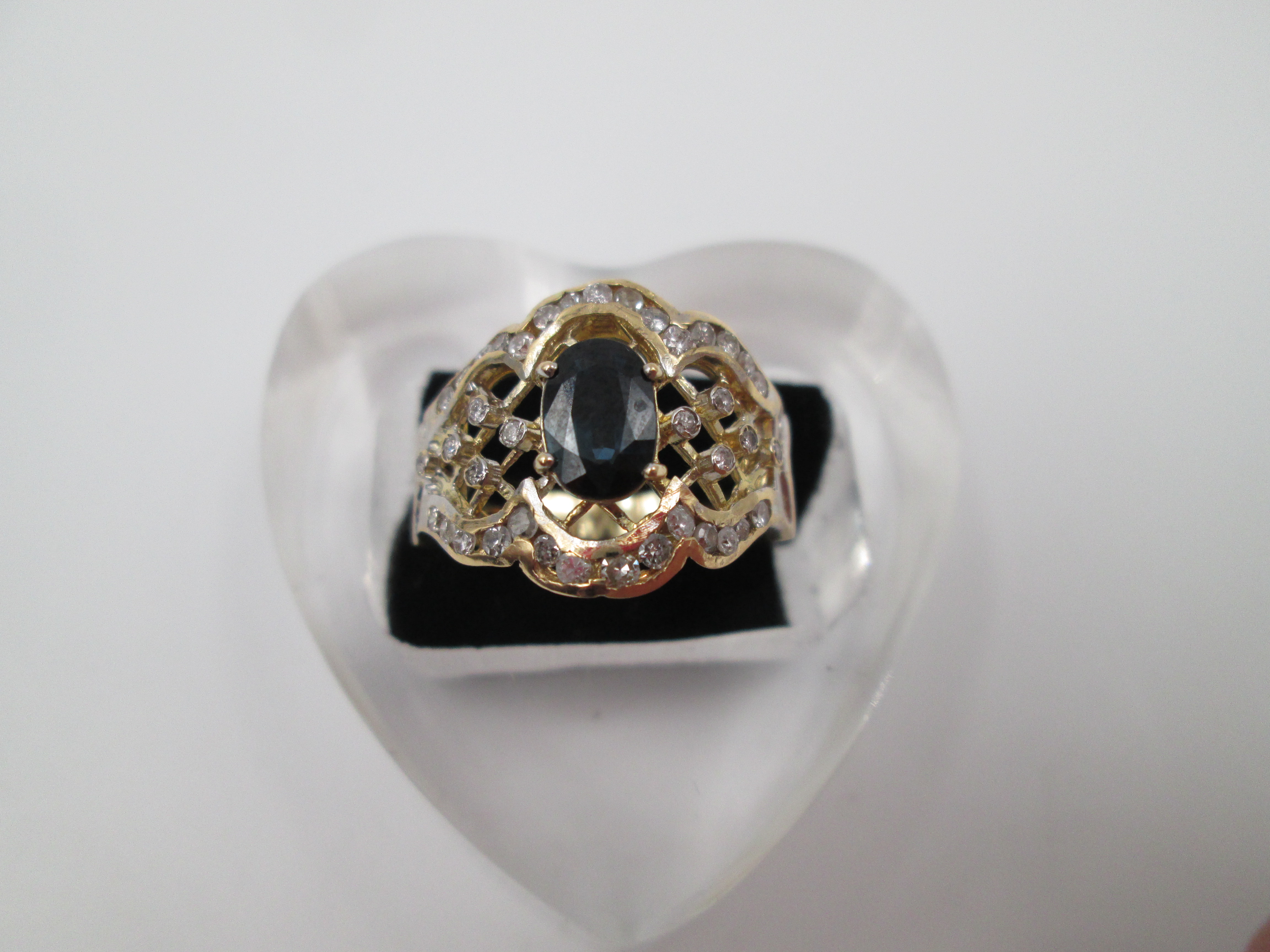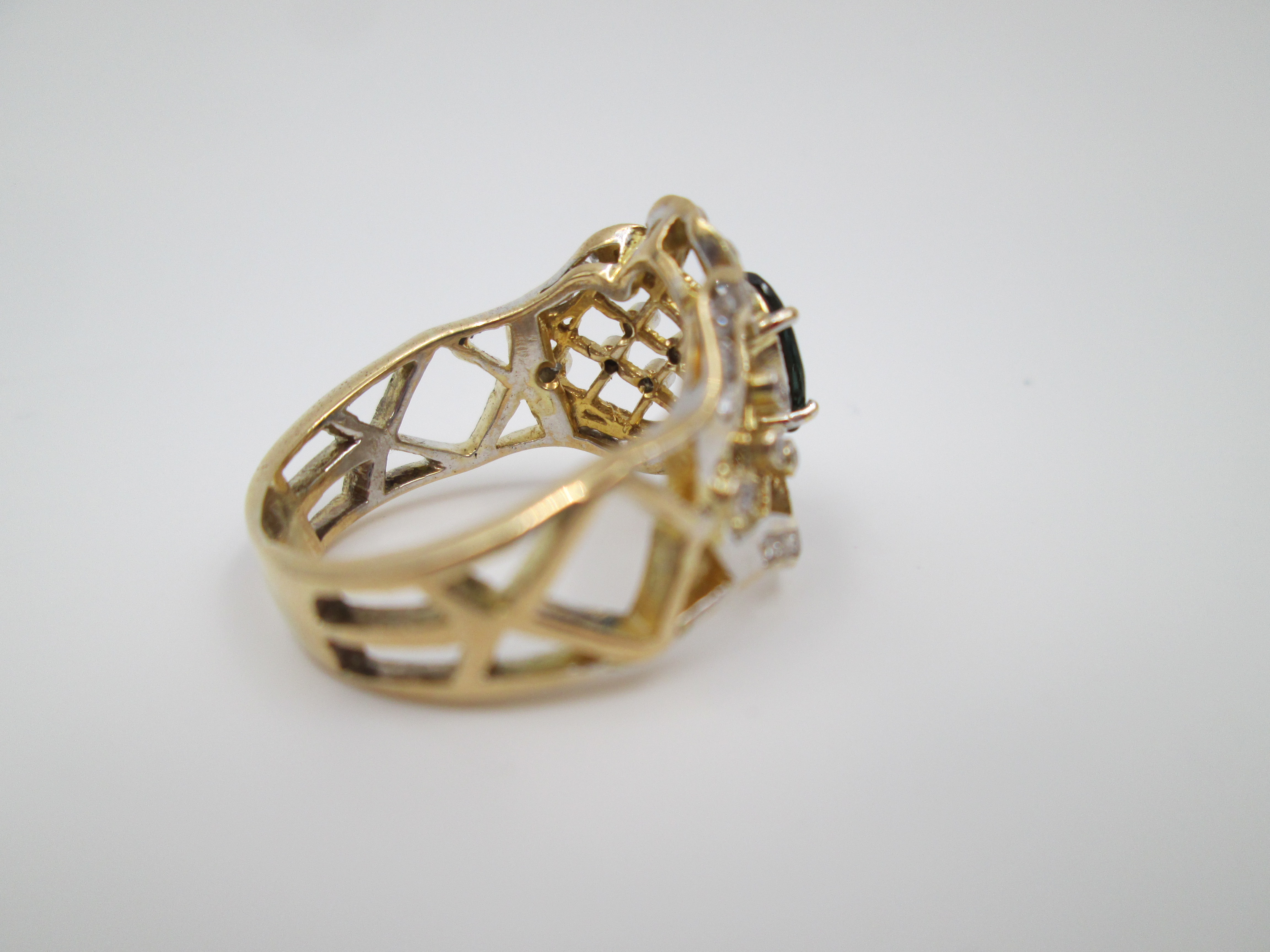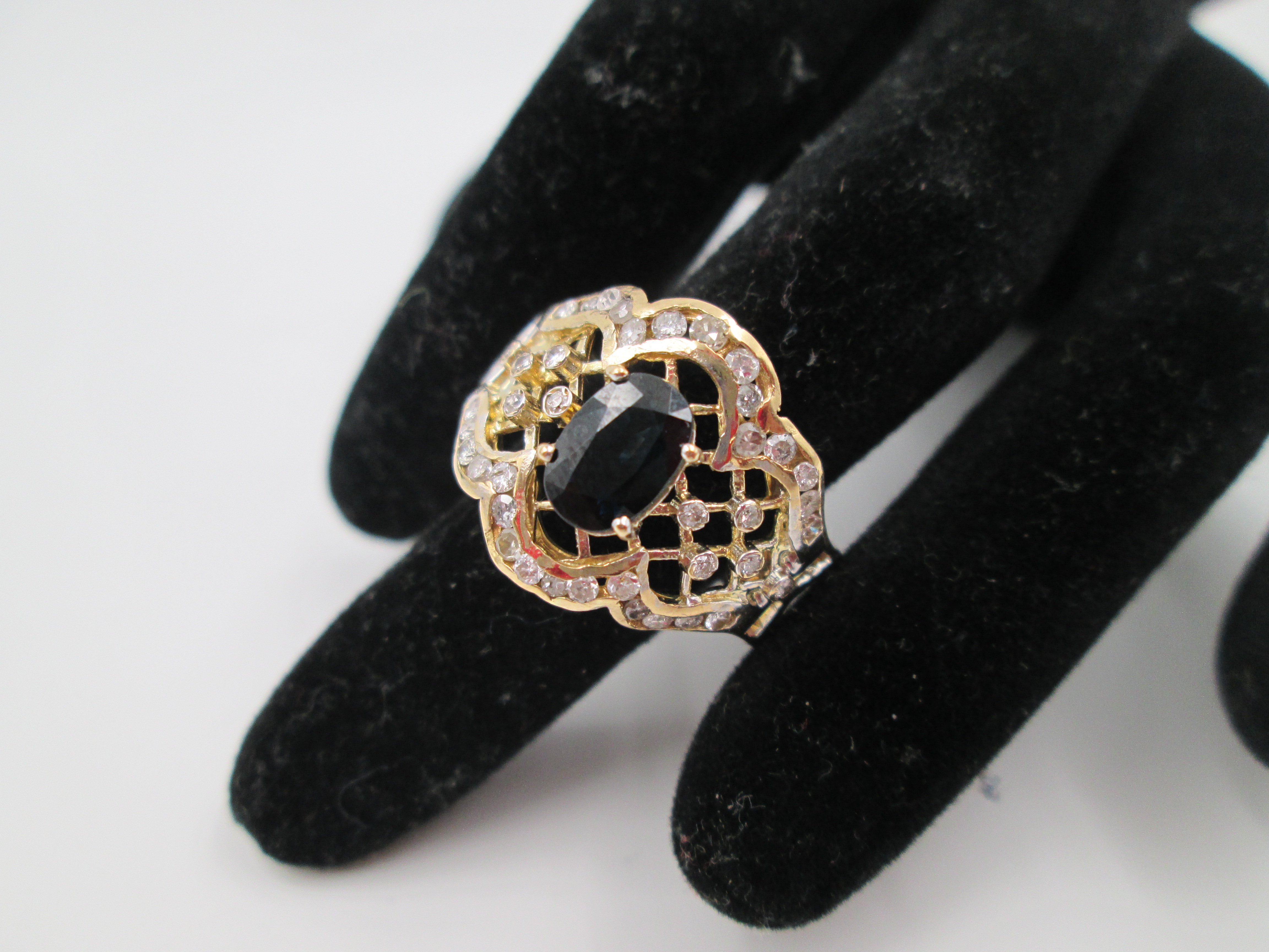 Women's openwork ring. 18 karat yellow gold, diamonds and sapphire. Europe
